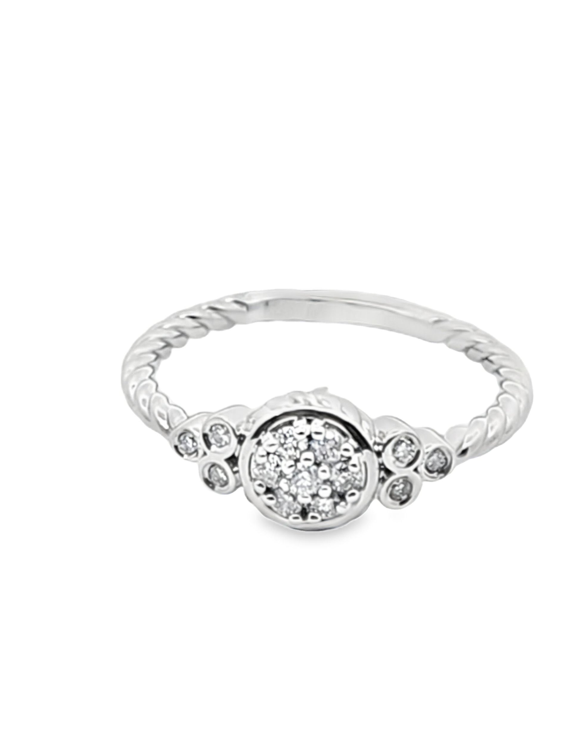 This Diamond ring features a Classic Cluster in a Round Shaped Mounting with Shoulders of Three Diamonds on Each Side making it an Amazing Ring. The total diamond weight is 0.20 Ct