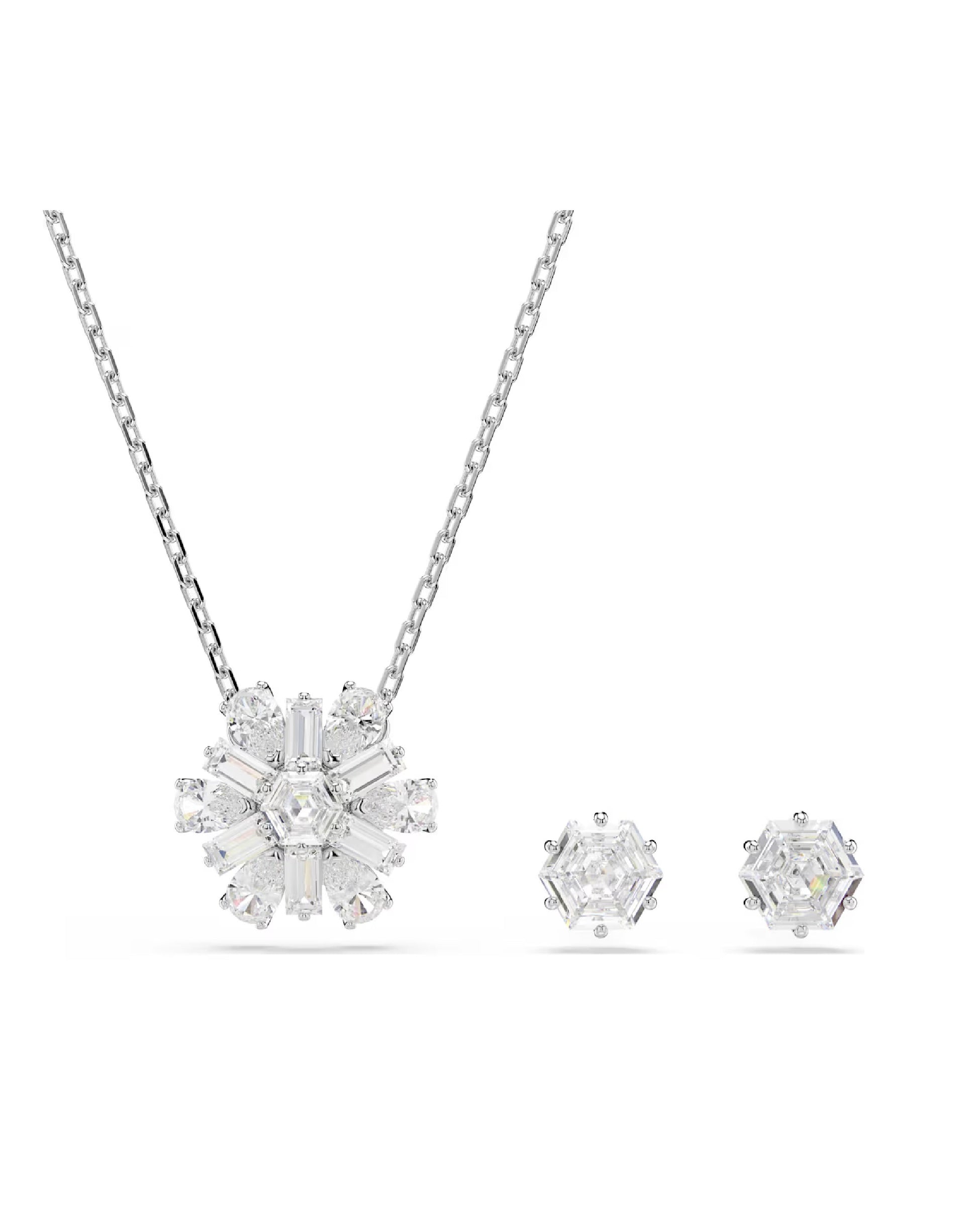 Inspired by winter snow, this glistening jewelry set showcases the spellbinding beauty of nature. Featuring a pendant and pair of pierced stud earrings, each piece in this set is shaped like a snowflake and crafted in rhodium plating and an array of clear prong-set Swarovski Zirconia. A magical combination that is made to mesmerize.
