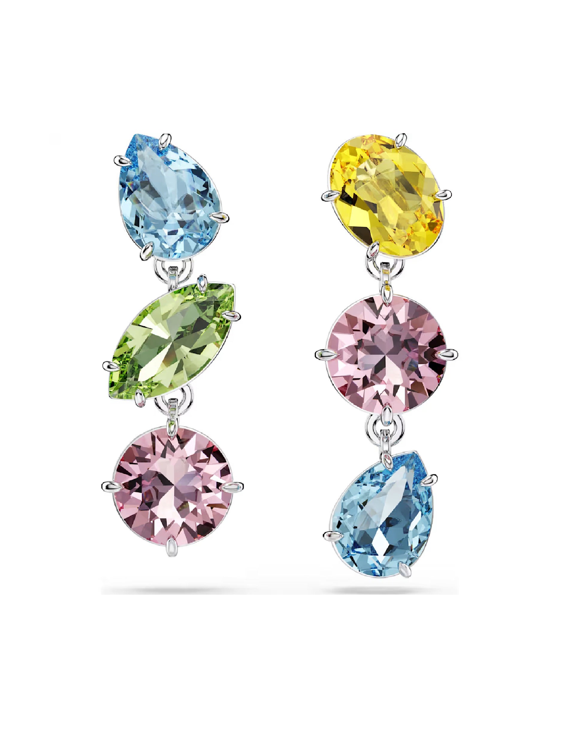 Put your true colors on display with these playful pierced earrings. In signature Gema style, these rhodium plated pieces feature stones in a mix of shapes and hues, artfully suspended in two asymmetrical strands. Wear with a matching pendant and prepare to attract compliments.