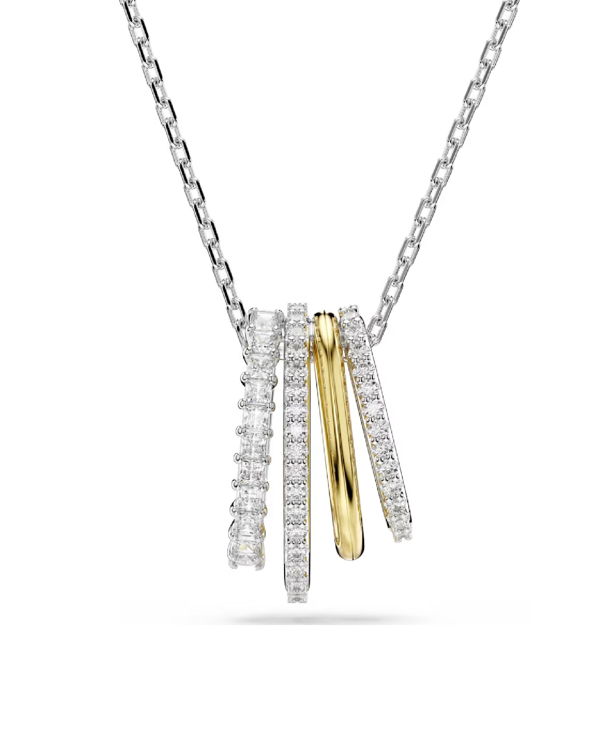 This eye-catching Hyperbola pendant blends multiple tones and techniques to create a distinctive take on refined luxury. Attached to an elegant chain, the four mini hoops are presented in gold-tone and rhodium plating, embellished with round- and square-cut Swarovski Zirconia in a prong setting. Style with a matching bangle or earrings for maximum glamour.