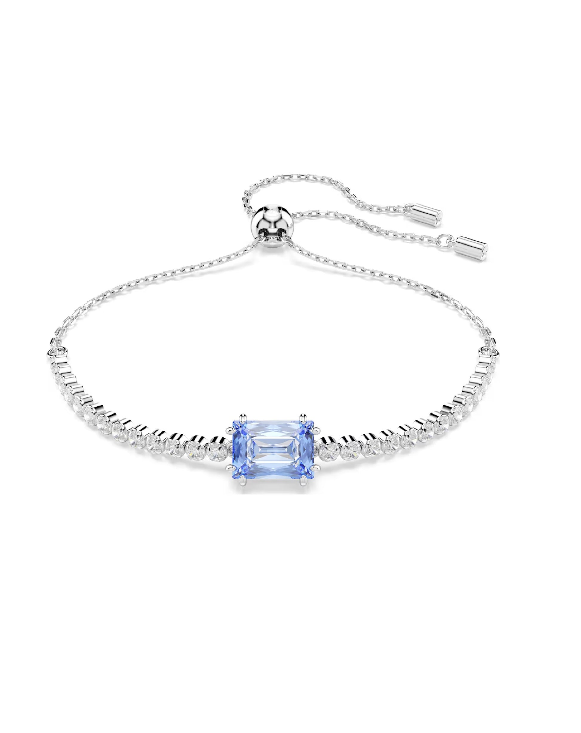 Adding a touch of radiance to any look, this classic tennis bracelet combines clear Swarovski Zirconia with a pop of color. Fastened with a sliding closure, the rhodium plated jewelry features a uniform row of clear Swarovski Zirconia and is accented with a baguette-cut blue Swarovski Zirconia at its center. A vibrant twist on a timeless style.