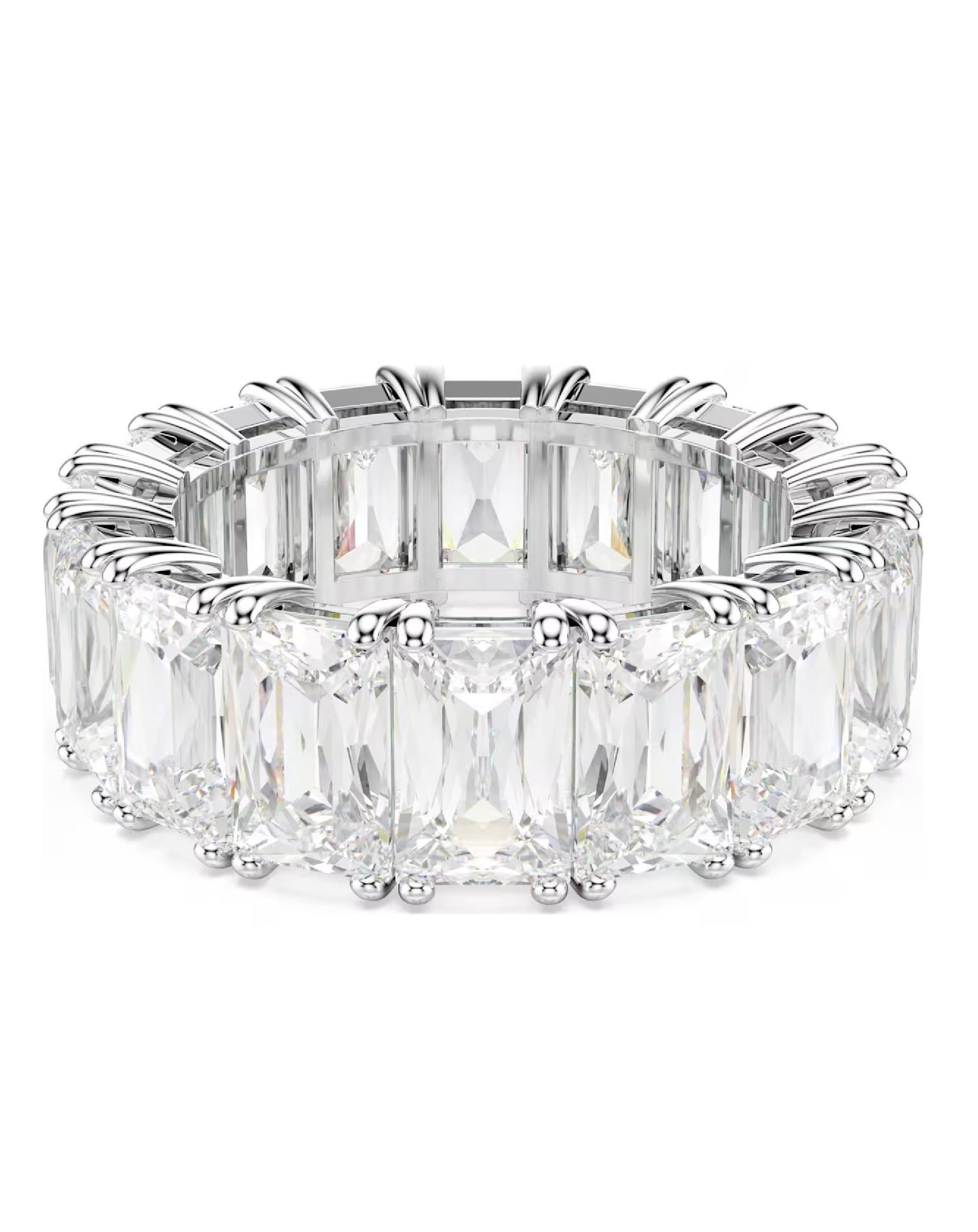 A striking, elegant look distinguishes this Swarovski ring. A row of gleaming white stones, cut into a faceted, rectangular shape, lends it an air of refined simplicity. The unbroken line of sparkling stones defines the character of the design and matches well with equally elegant pieces of jewelry, especially other rings to create an attractive and on-trend stacking look. A great match for special occasions, and an inspired gift giving idea.