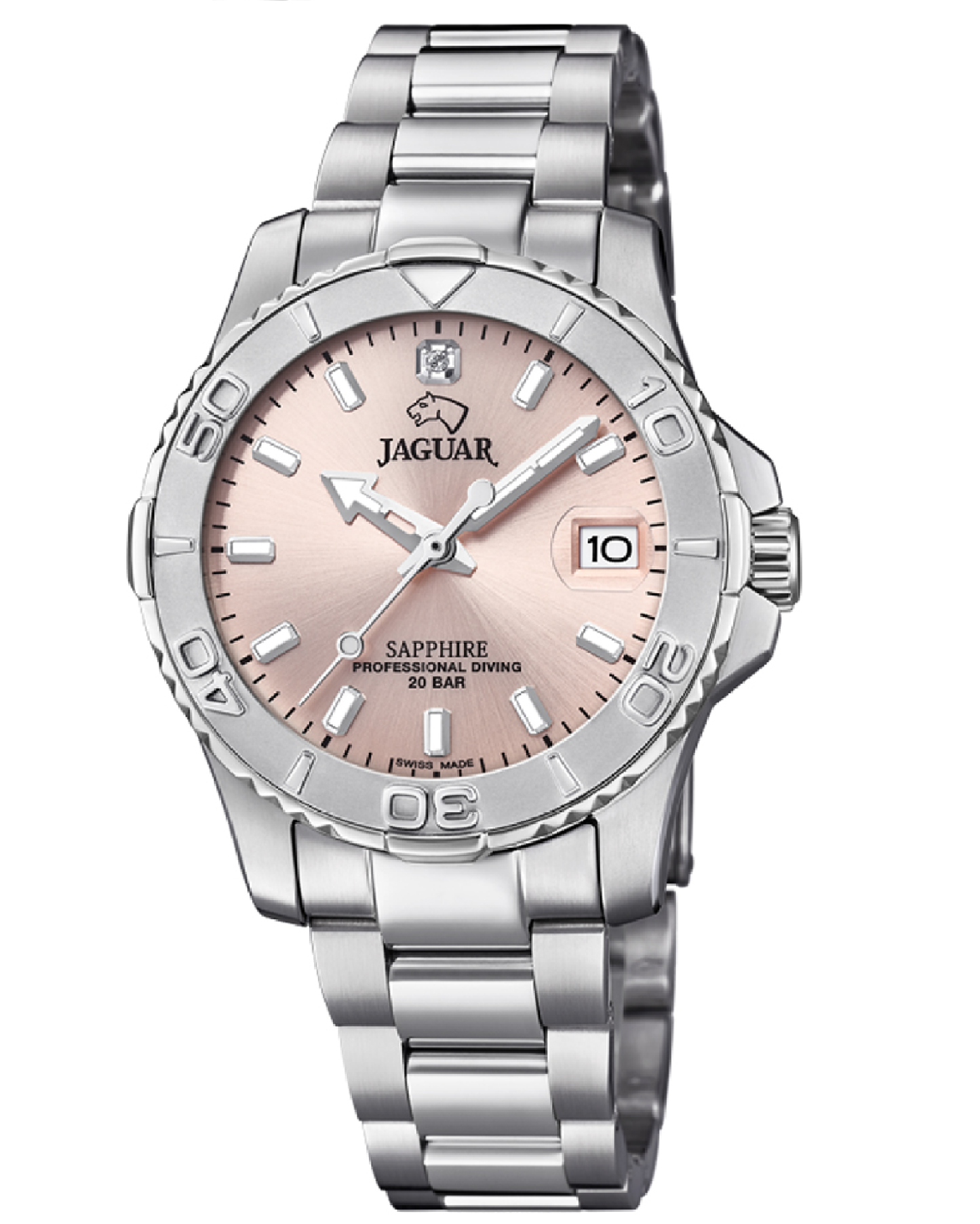 This Jaguar brand watch has a stainless steel case with a diameter of 34 mm and has a metal strap. Inside the case there is a high quality Ronda mechanism which is protected by a Sapphire crystal.
