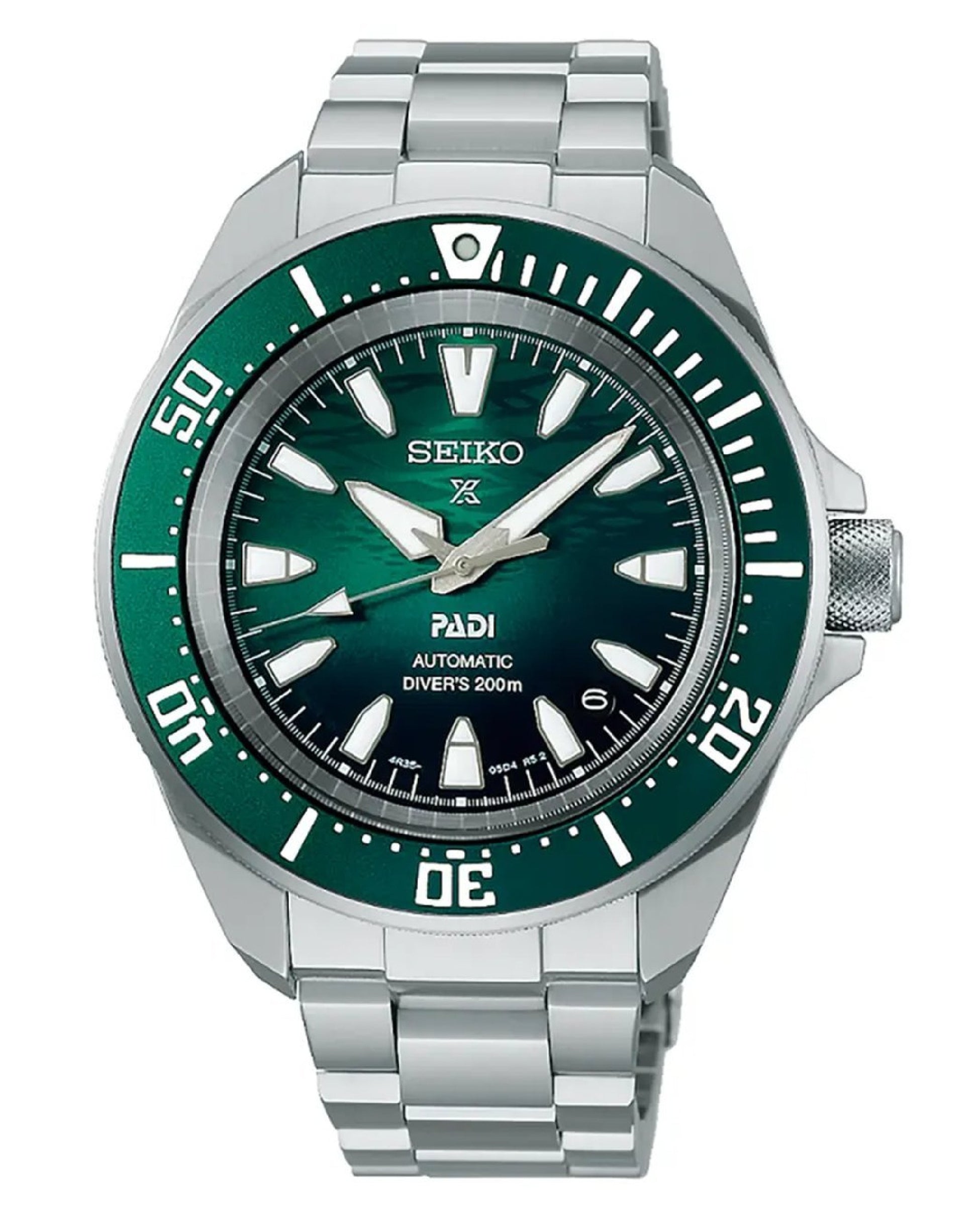 This is the Prospex Collection, this Seiko watch features a Green dial and Bezel. The Stainless Steel gives this watch a sportiv touch. This comes with a Seiko Official box and a 2 year international warranty.