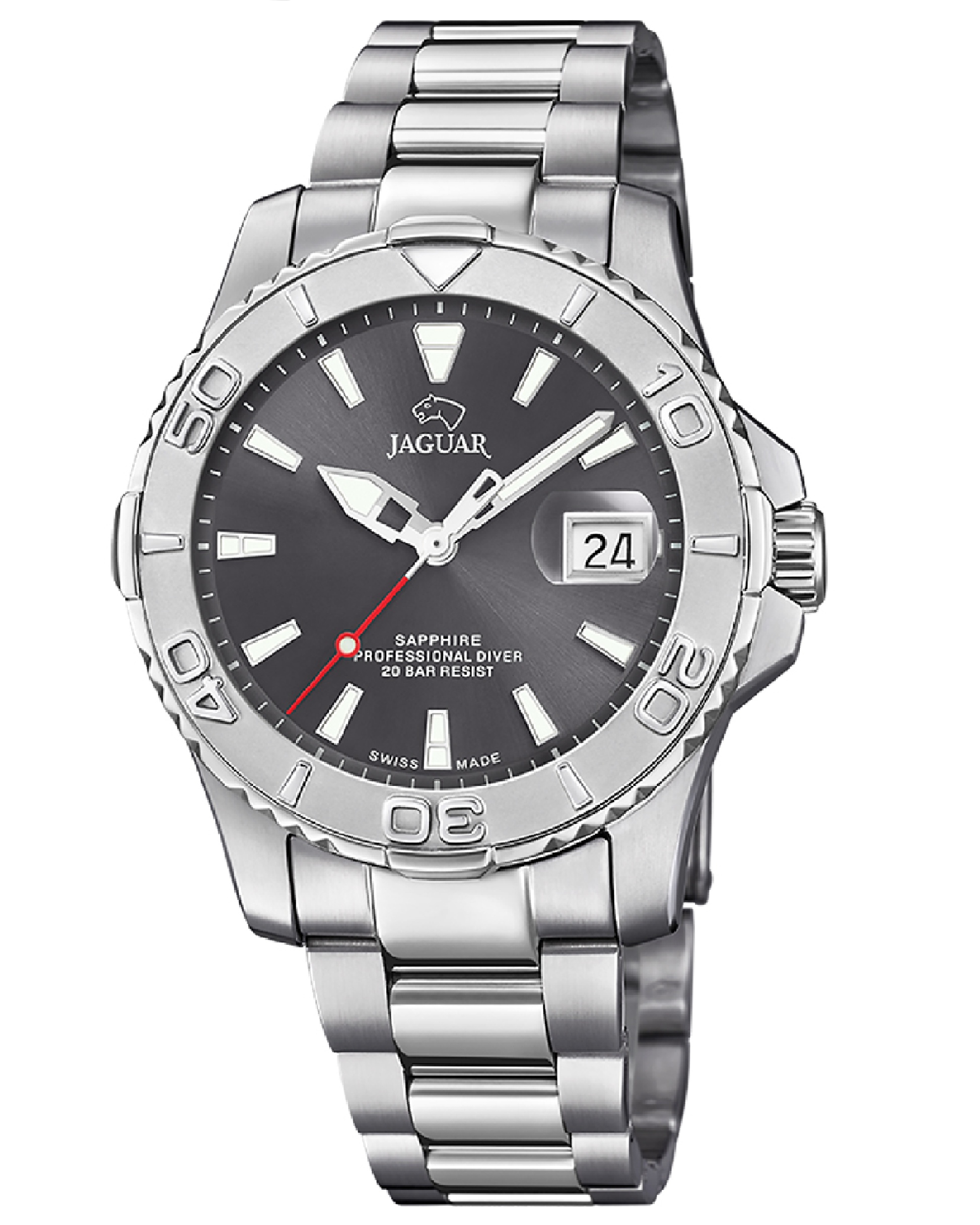 This Jaguar watch has a stainless steel case with a diameter of 40 mm and has a metal strap. Inside the case is a high quality Ronda mechanism which is protected by a Sapphire crystal.