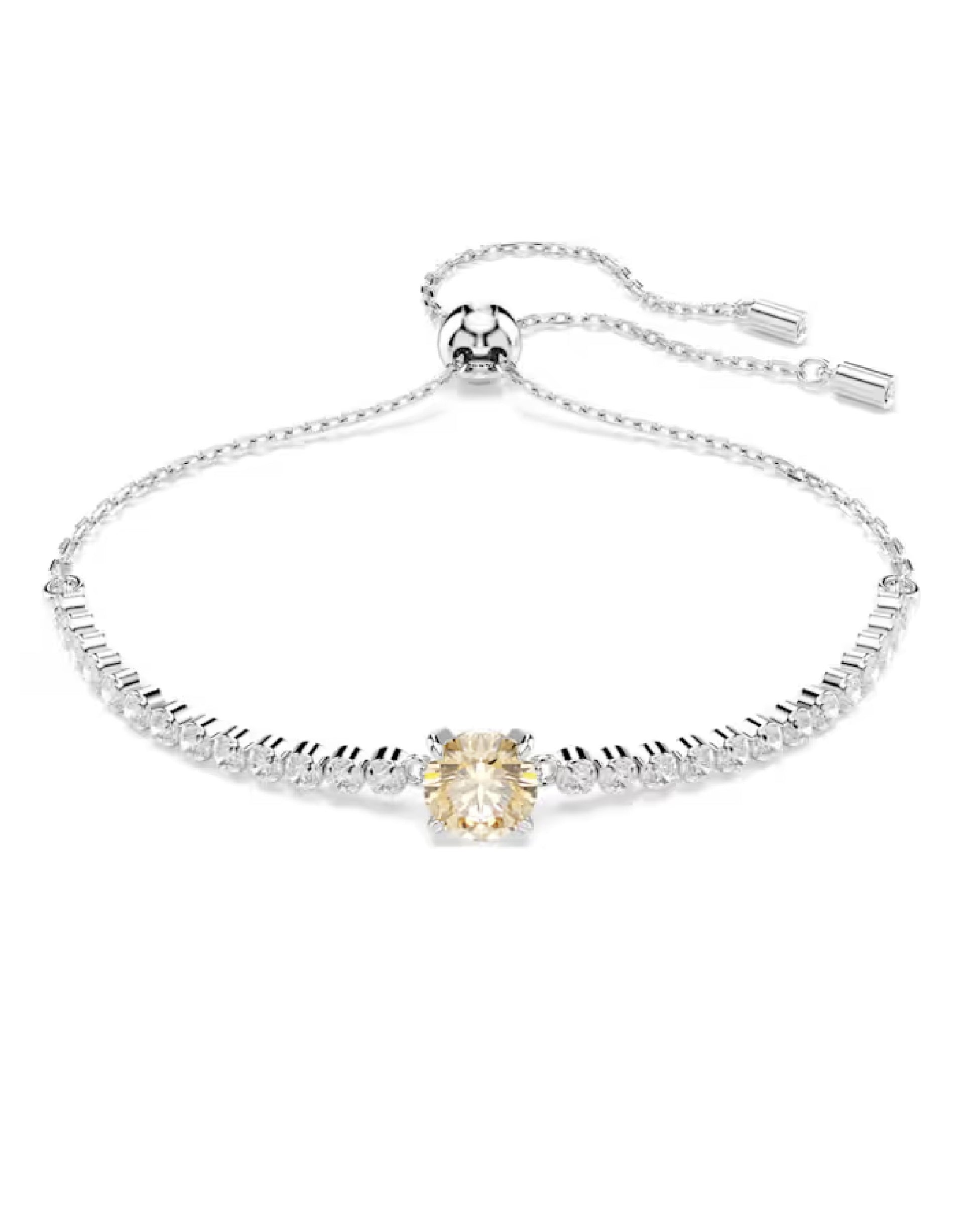 Adding a touch of sparkle to any look, the classic tennis bracelet combines clear Swarovski Zirconia with a touch of color. Fastening with a sliding clasp, this rhodium-plated accessory features an even row of clear Swarovski Zirconia and a baguette-cut green Swarovski Zirconia in the center to add a pop of color. A vibrant take on a timeless style.