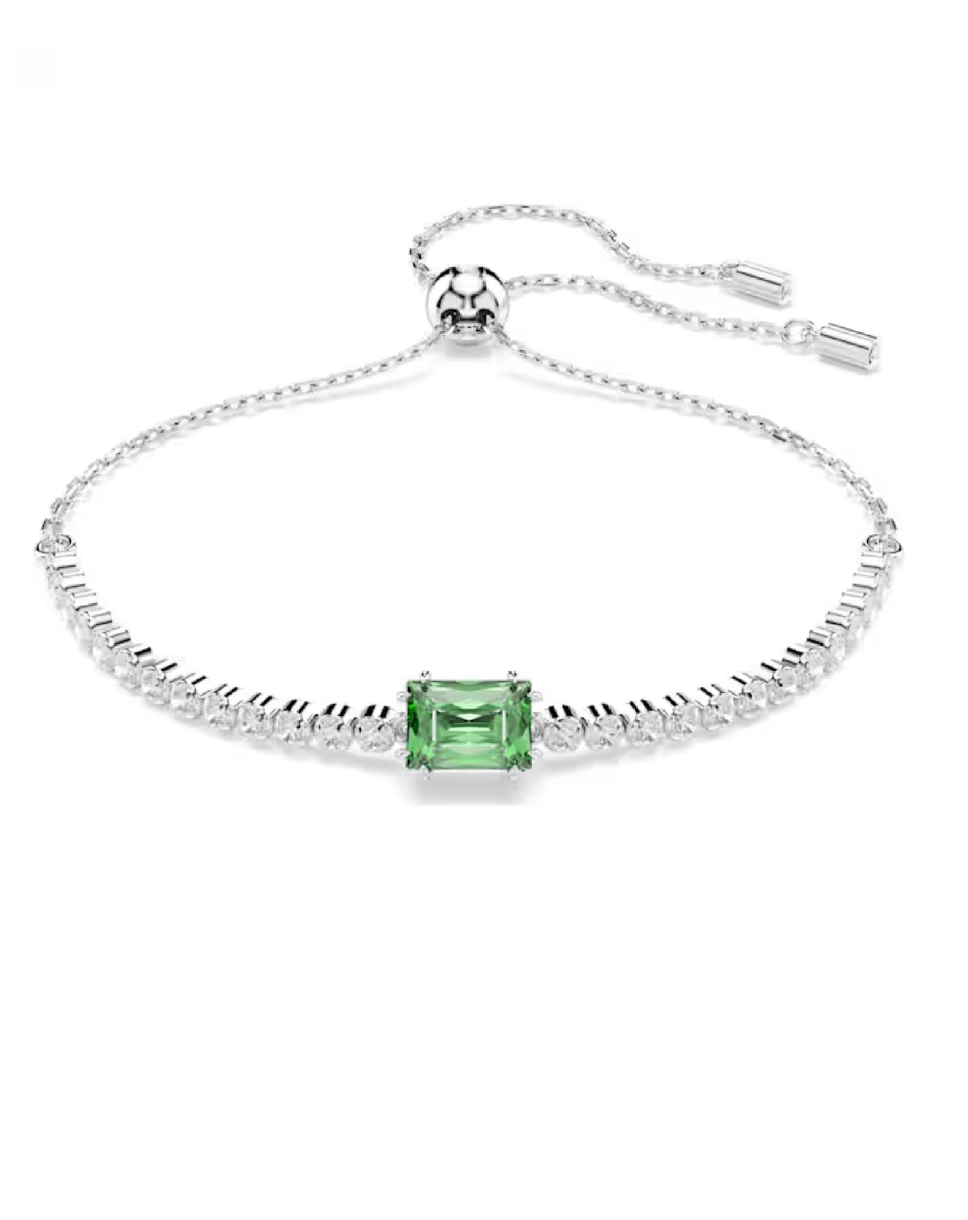Adding a touch of sparkle to any look, the classic tennis bracelet combines clear Swarovski Zirconia with a touch of color. Fastening with a sliding clasp, this rhodium-plated accessory features an even row of clear Swarovski Zirconia and a baguette-cut green Swarovski Zirconia in the center to add a pop of color. A vibrant take on a timeless style.