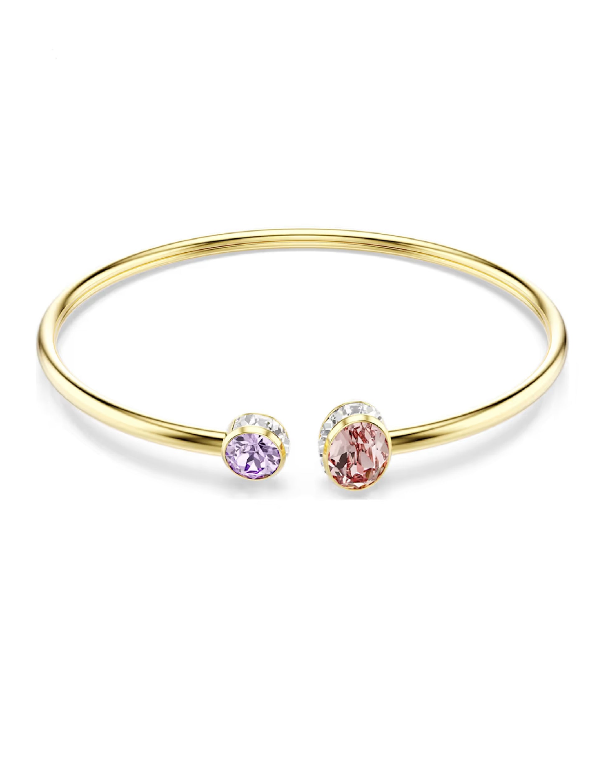A simple silhouette with delicate colors, this Chroma bangle adds a layer of soft-tone sophistication to any look. The gold-tone design is made for flexibility. It has pink and purple crystals on the tips. It slips easily onto the wrist for an all-day glow.