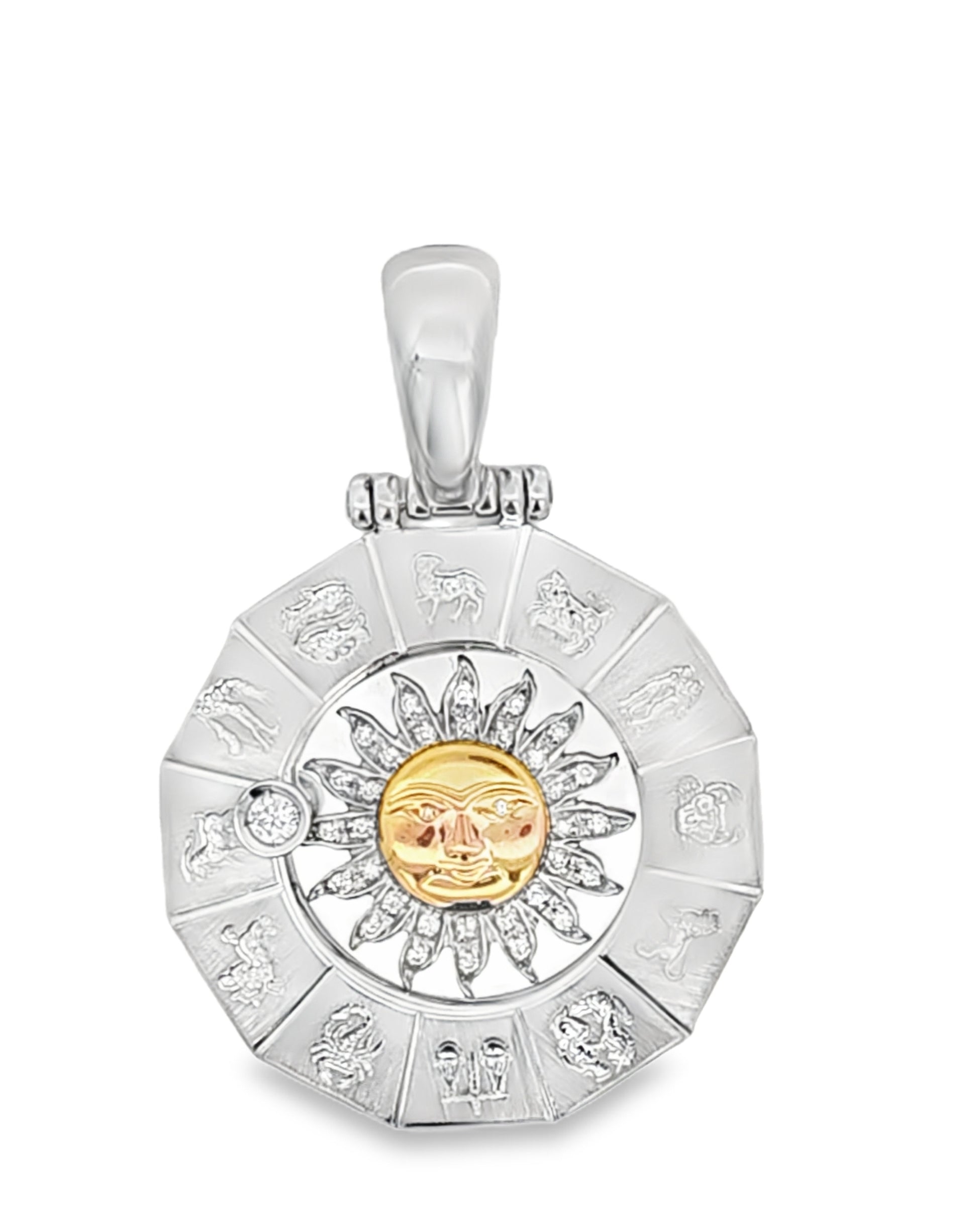 An Horoscope in the Center Of a Round Silhouette Diamond encrusted is very exquisite Pendant. The total Diamond Weight is 1.01 Ct