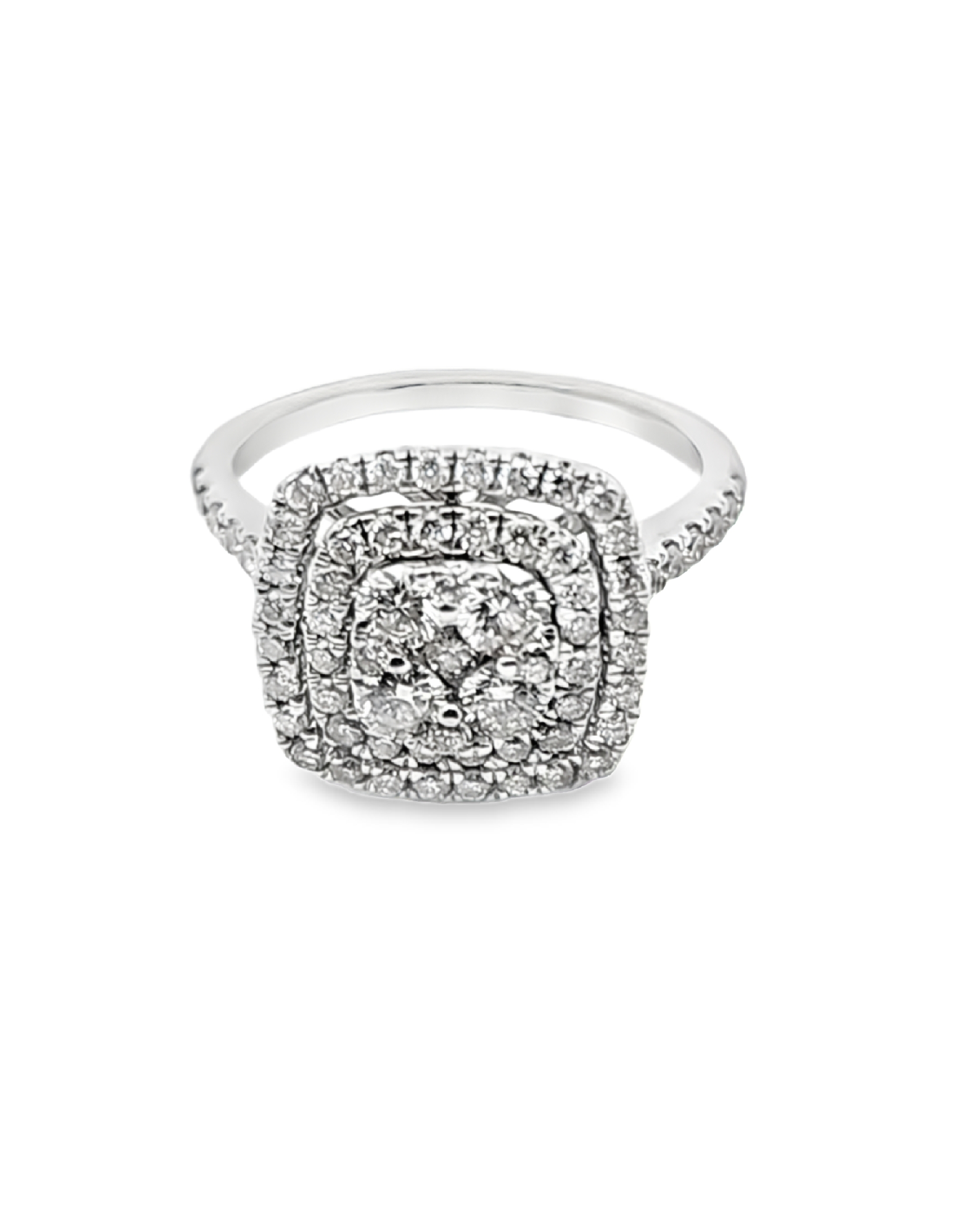 Este anillo de diamantes de oro blanco presenta diamantes de talla brillante redonda y en montura de punta, diamantes de talla princesa en montura de punta A. Peso total del diamante 0,10 Ct