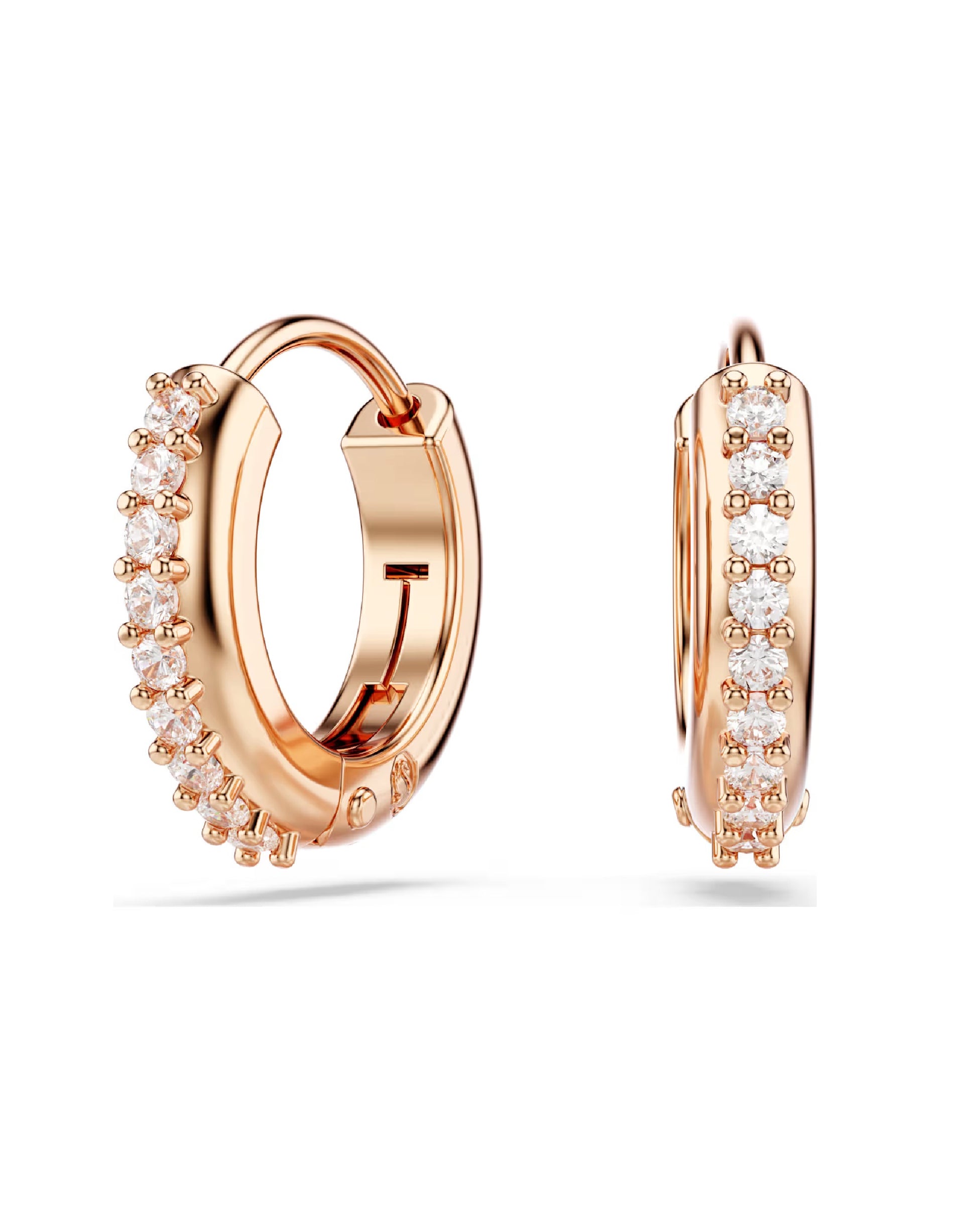 Ignite your style with these shimmering mini hoops. The pierced earrings are rose gold-tone plated and adorned with clear prong-set Swarovski Zirconia on the outer section. An easy way to illuminate any outfit.