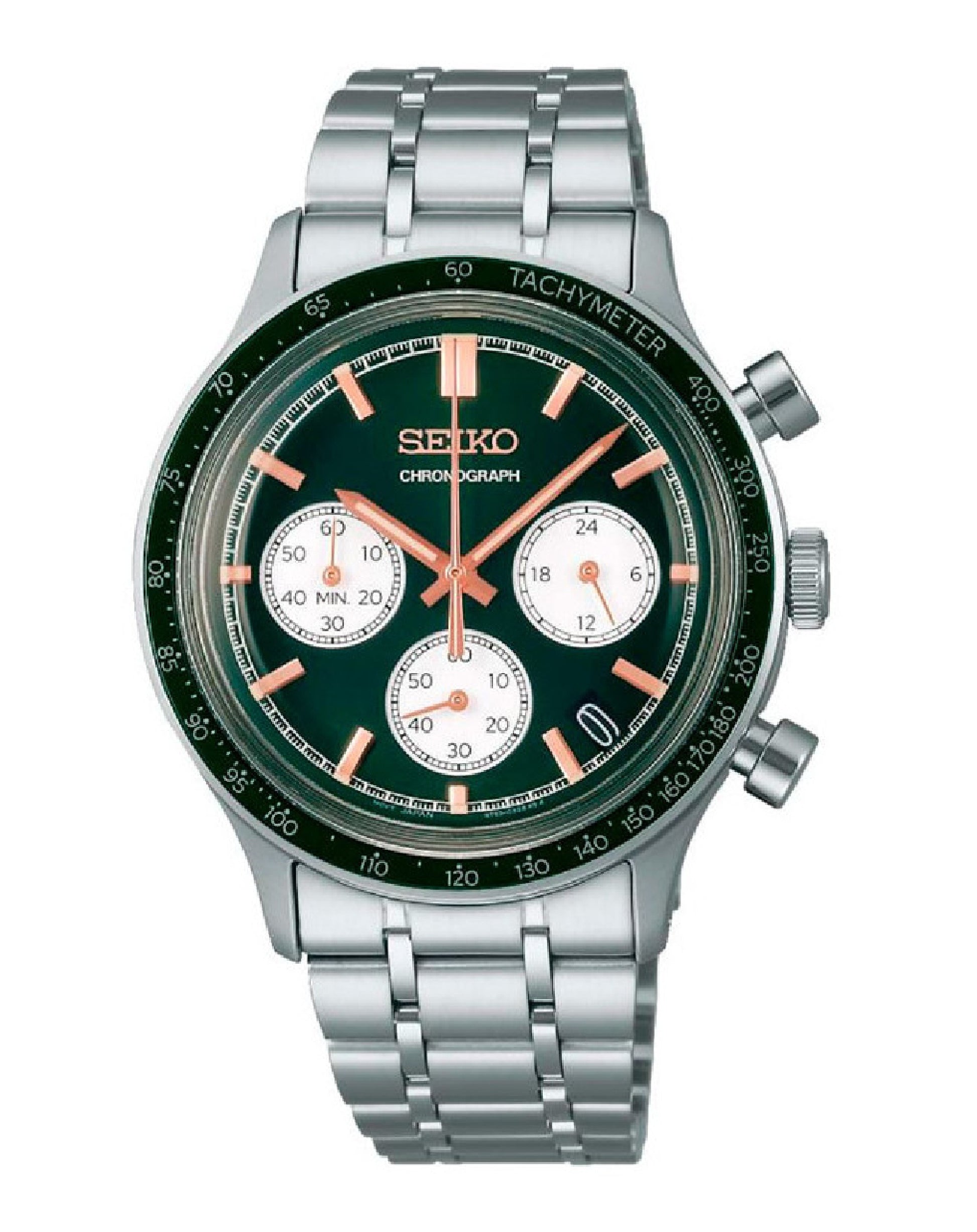 This is the SPORT Collection, this Seiko watch features a Green dial and  Bezel. The Stainless Steel gives this watch a sportiv touch. This comes with a Seiko Official box and a 2 year international warranty.