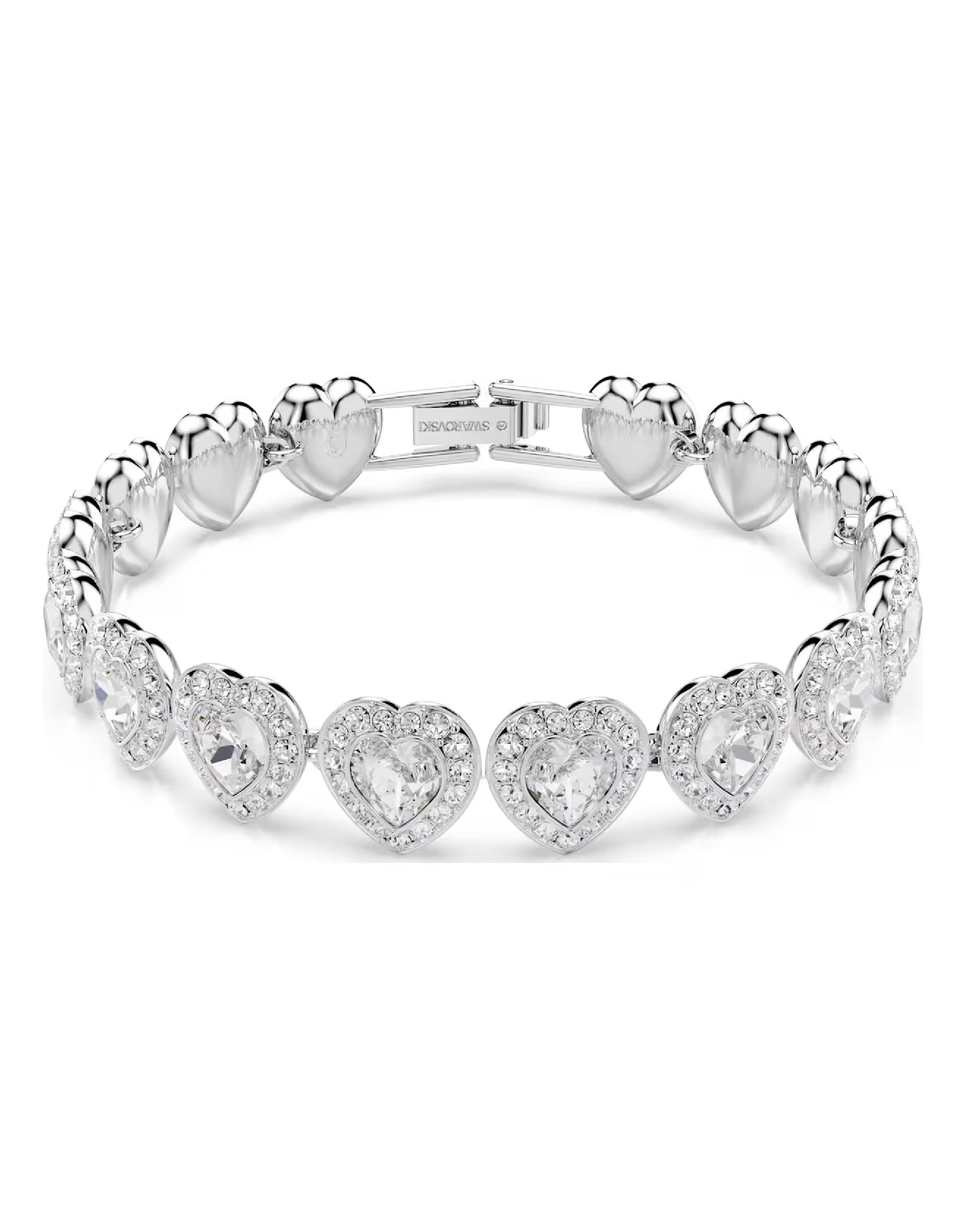 Love shines brightly in this Swarovski bracelet, which takes romantic extravagance to the next level. The rhodium plated design features a full circle of heart-shaped crystals, each surrounded by a glittering halo of clear pavé. Pair this bracelet with other matching jewelry to create your own expressive combinations.