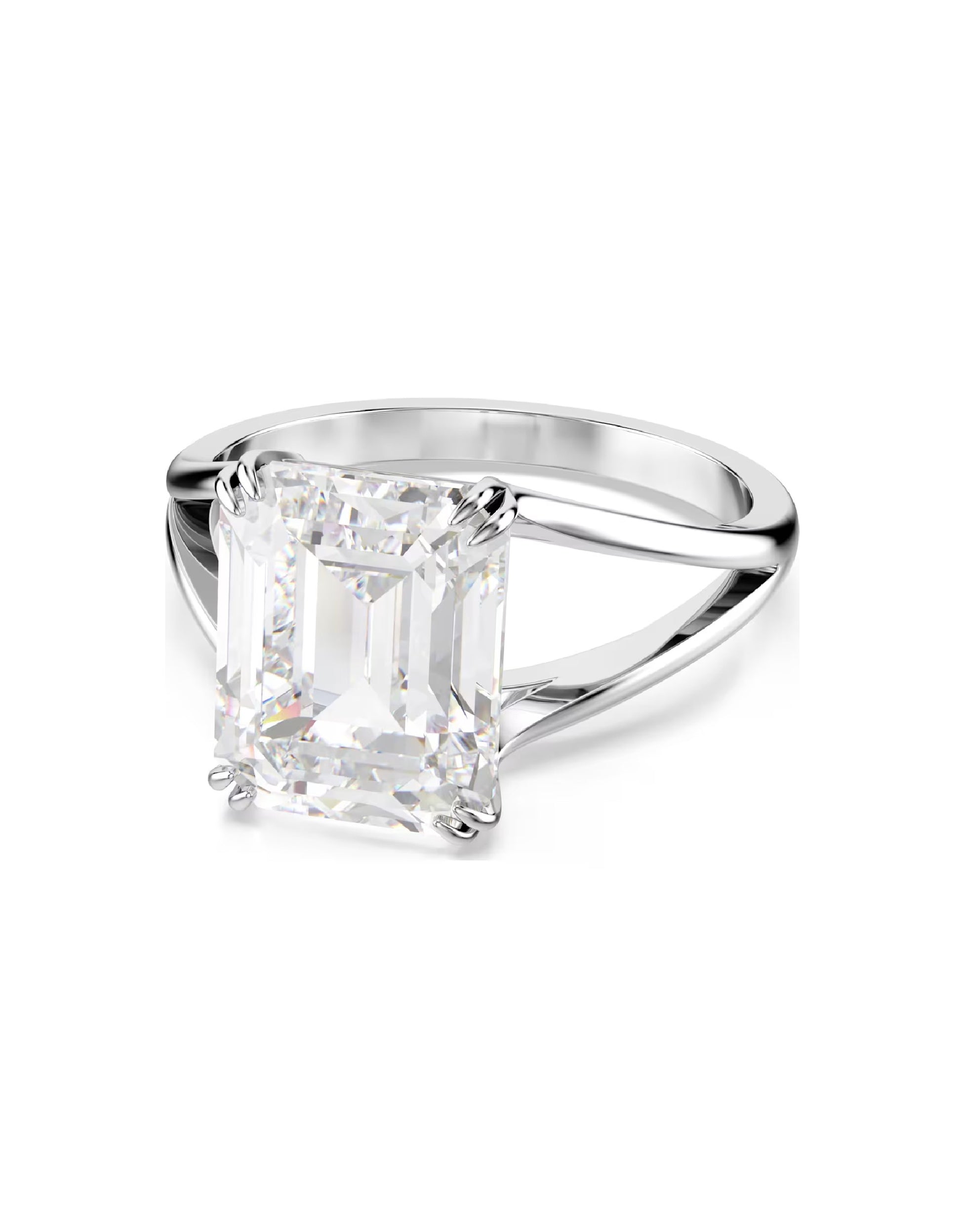 Dial up the glamour with this radiant cocktail ring. The rhodium plated design features a split band with an octagon-cut Swarovski Zirconia at the center, held in place with a refined double prong setting. A showstopping piece that shimmers brilliantly.