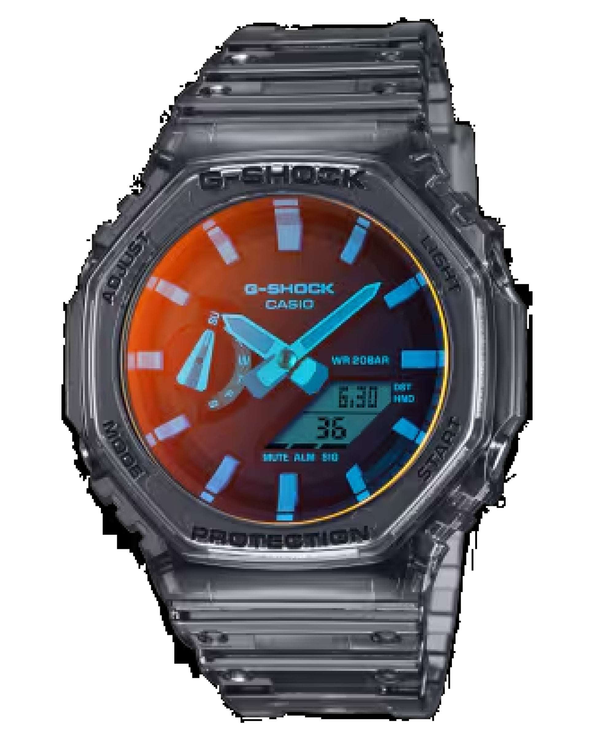From G-SHOCK, watches that evolve in search of maximum resistance, the Skeleton series models are made with translucent resin parts. The color is transparent with a White base. Based on the popular GA-2100 model with its Carbon Core Guard structure and octagonal bezel, this stylishly colored Skeleton Series model is meant to be a true fashion statement.
